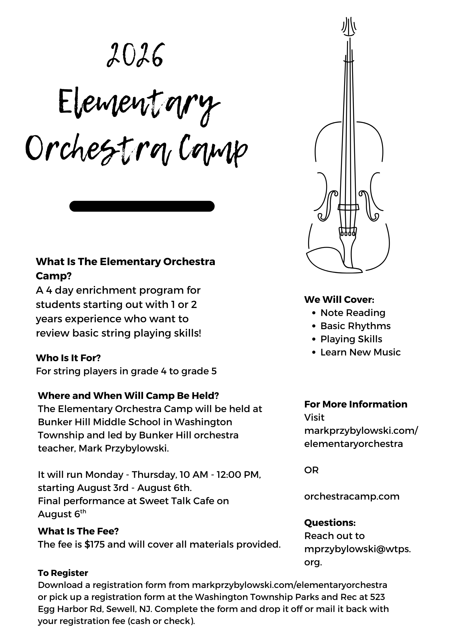 The Elementary Orchestra Camp will be held from 10 AM - 12:00 PM, Monday thru Thursday, starting on August 3rd - August 6th at Bunker Hill Middle School in Washington Township.