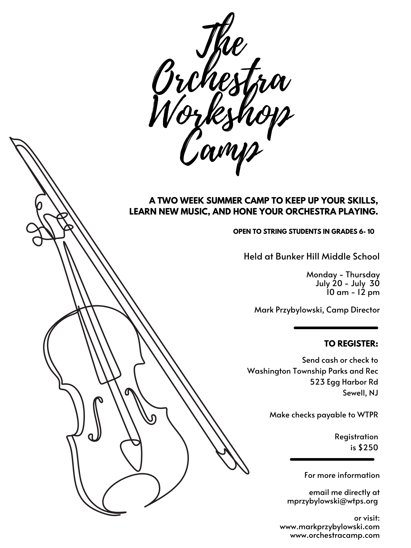 The Orchestra Workshop is a two-week camp held Monday thru Thursday, 10 am to 12: 00 pm, for two consecutive weeks. The camp will be held at Bunker Hill Middle school in Washington Township. Students should bring a snack each day.
